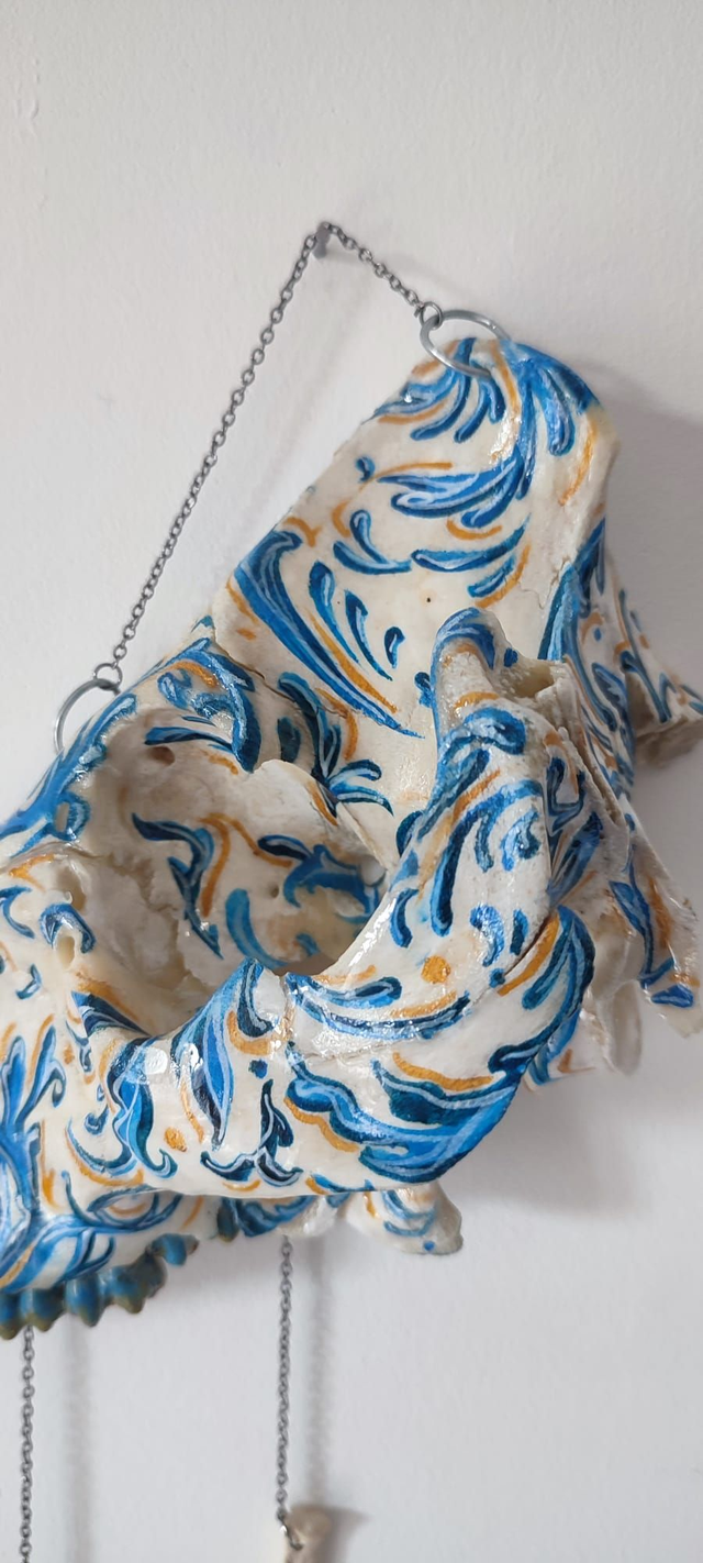 Peinture acrylique, motifs de porcelaine et résine epoxy Bi phasée.