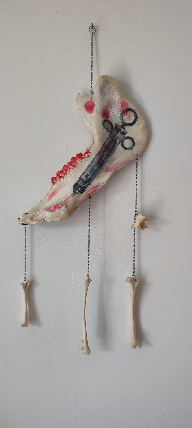Peinture acrylique, motifs instruments de torture et résine epoxy Bi phasée.